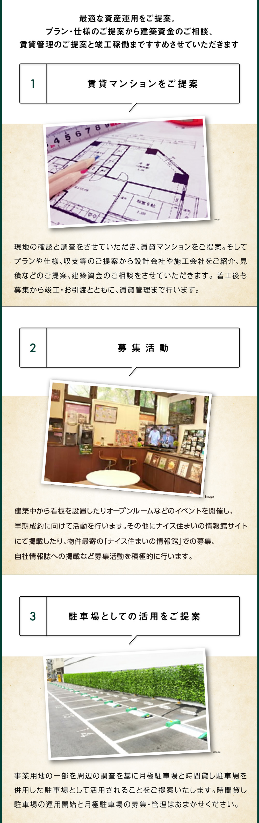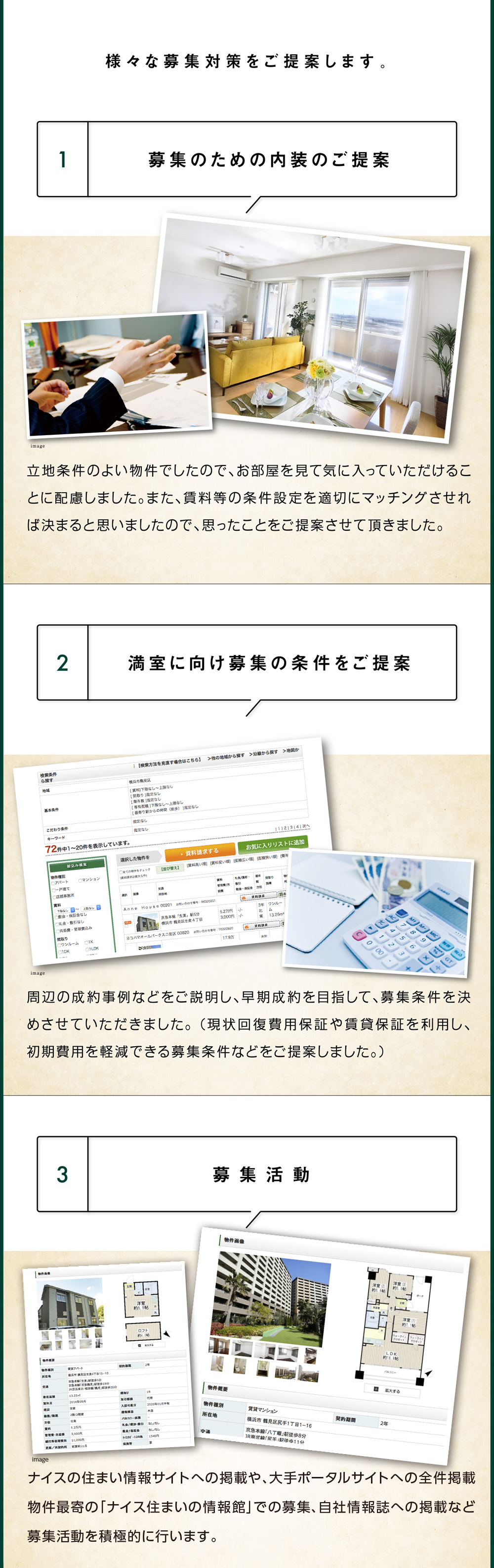 また、直近の賃貸動向、相場変遷も理解しており、お客様のいつから貸したい等のご事情とマーケットの状況を鑑みた最適な販売戦略を立案させていただきます。